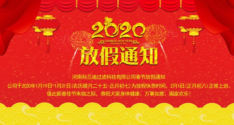 河南科蘭迪過(guò)濾科技有限公司全體員工在這里給大家拜個(gè)早年,感謝大家在過(guò)去幾年里對(duì)我司的產(chǎn)品質(zhì)量認(rèn)可與信賴,在今后的日子里科蘭迪人將一如繼往更好的服務(wù)每位顧客。值此新春佳節(jié)來(lái)臨之際,恭祝大家身體健康!萬(wàn)事如意!闔家歡樂(lè)!鼠年大吉大利!