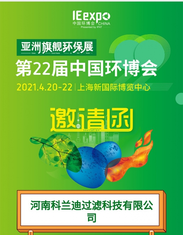 河南科蘭迪過濾科技有限公司將于2021年4月20日-4月22日參加為期3天的產(chǎn)品展覽,邀請各屆朋友來我司展臺參觀考察。恭候您的光臨!