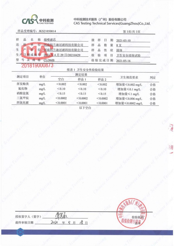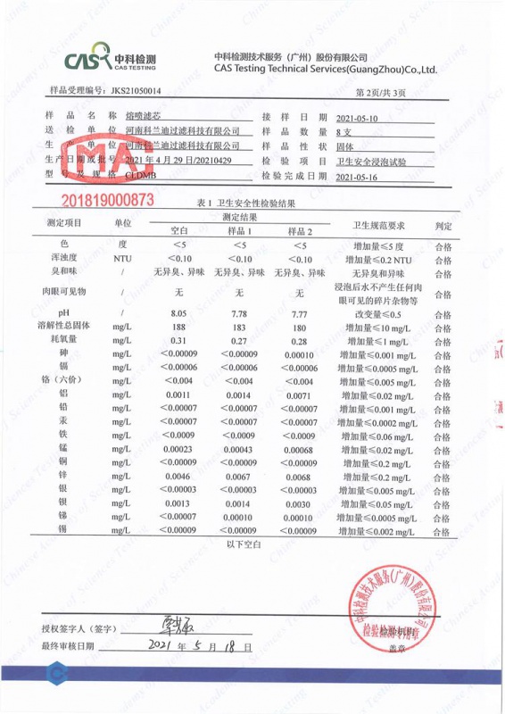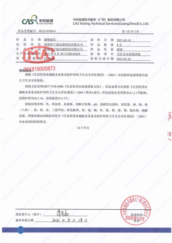 河南科蘭迪過(guò)濾生產(chǎn)的PP熔噴濾芯經(jīng)過(guò)具有CMA認(rèn)證的第三方實(shí)驗(yàn)室“中科檢測(cè)公司”檢測(cè)符合《生活飲用水輸配水設(shè)備及防護(hù)材料衛(wèi)生安全評(píng)價(jià)規(guī)范》(2001)中對(duì)水處理材料的要求。