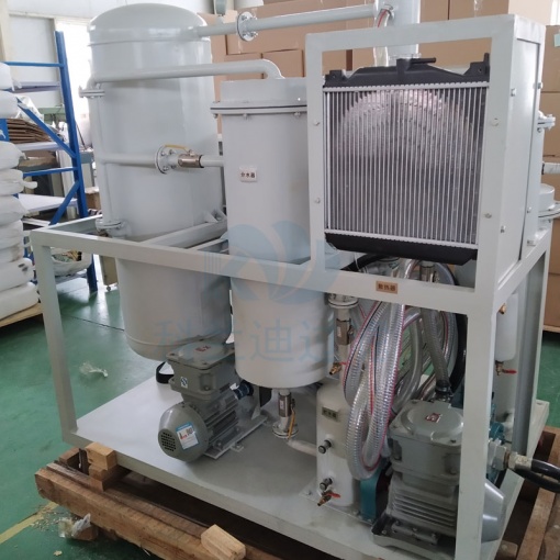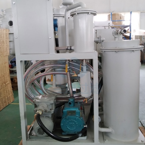 目前用于200MW機組的國產油凈化裝置主要是利用沉降和過濾原理,其基本結構由沉積箱、過濾箱和貯油箱構成。在沉積箱中設有多層分離網,依靠油和水的重力差,油中的水在穿過分離網時凝聚成水滴,沉降在箱體下部,由自動抽水器排出箱體外。這些凈油設備設計容量較大,體積尺寸也較大,而且從使用情況看,普遍存在著除水效果差、油臟、易堵塞凈化裝置等現(xiàn)象。另外也有采用普通真空式凈化裝置,利用閃蒸原理除水并用網狀過濾器除雜質,這類裝置宜于脫除油中的微量水分,但對于漏水嚴重的機組,尤其是乳化的油液往往無能為力,也不宜于連續(xù)投入運行。若使用TY型汽輪機透平油專用濾油機,不但可以有效去除油中的空氣、水及雜質,而且能夠自動破乳化。從而實現(xiàn)對發(fā)電汽輪機機組的透平油凈化的目的。